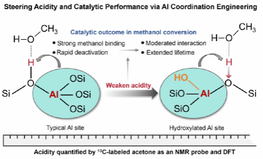 該研究創新性地從“配位工程”角度切入,提出通過蒸汽處理在沸石骨架鋁位點引入羟基配位,從而精細調控其局域化學環境與酸性強度。團隊結合密度泛函理論計算與多維固體核磁共振技術,從原子尺度揭示羟基配位對酸強度的漸進弱化機制,并證實其對甲醇吸附與活化行為的抑制作用。在甲醇制烯烴反應中,經羟基化調變的催化劑在保持高轉化率的同時,使用壽命顯著延長,實現了活性與穩定性的協同提升。該研究不僅從分子層面闡明了配位環境對沸石酸性及催化性能的調控機制,也為工業催化劑理性設計提供了新思路,對推動綠色化工與能源催化技術的發展具有重要意義。