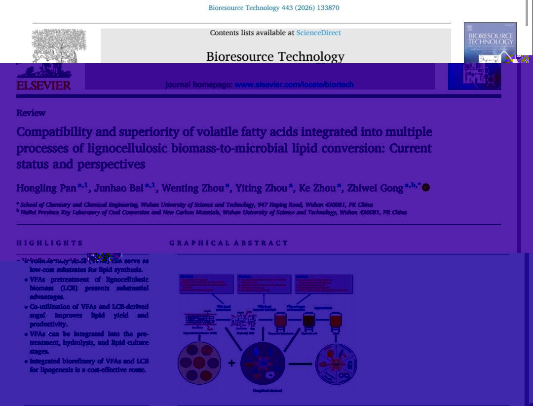 武科大網訊(通訊員李江江)近日,我校永利6774app手机版官网生物工程專業2023級本科生潘洪玲和柏俊豪以共同第一作者身份在生物能源類領域SCI期刊《Bioresource Technology》(中科院1區TOP期刊)發表了題為“Compatibility processes of lignocellulosic biomass-to-microbial lipid conversion: Current status and perspectives”的綜述文章(Bioresour. Technol.,2026,443,133870),該文章介紹了揮發性脂肪酸(VFAs)與木質纖維素生物質(LCB)整合用于微生物脂質生産的兼容性、優勢、應用及未來方向。論文指導老師、通訊作者為永利6774app手机版官网生物工程系龔志偉副教授,永利6774app手机版官网為論文第一單位。